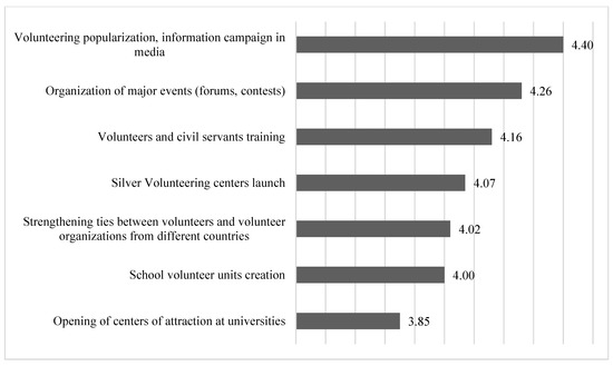 According to experts, the highest efficiency was achieved by popularizing volunteerism in the media (average rating of 4.4 out of 5) and during major events—forums, contests, etc. (average rating of 4.3 out of 5). The most ambiguous assessments were received by initiatives to open centers of attraction in universities (3.9), to create school volunteer groups (4.0), to strengthen ties with volunteer organizations in other countries (4.0), and to launch Silver Volunteering centers (4.1).