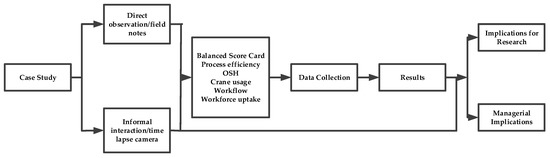 This qualitative research design workflow (Figure 2) involved observing real-life on-site cases during the construction phase [46,50], with concurrent data gathering from multiple work packages—e.g., observing and taking field notes on the work packages and operatives undertaking their tasks [47]. The study also used qualitative audio-visual and digital tools (GoPro time-lapse camera with video capabilities) and unstructured, generally open-ended discussions with workers and managers to elicit views and opinions from the workforce [47,50]. The data gathering focused on multiple house types with different dimensions and designs within a new housing development, where the same logic would be replicated or adopted in successive builds. The study therefore required the researcher to holistically collaborate but without interfering with site operatives in the observation of their labor efficiency regarding the build process of the OSM timber kit homes using a telescopic crane to erect the buildings. This is considered as an effective approach for developing solutions to on-site problems of efficiency and safety, and it is also beneficial for the principal contractor responsible for the housing projects. It was ethical for the researcher to lay aside their own values and judgments shaped by practice to allow the direct observation of frontline workers to inform the research by being mindful of and attentive to the system and situational dynamics. Therefore, maintaining the balance between drawing from those available resources and the researcher giving up their own belief to subjectively collect data and analyze the research information was essential. This case study development was useful in potentially informing the principal contractor about developing strategies for optimizing the use of crane-erect technology, evaluating its commercial benefits, and benchmarking the perceived good practice with a view to rolling out an improvement program across the wider business to enhance efficiency, site safety, and productivity; minimize construction material waste; and build sustainable homes.