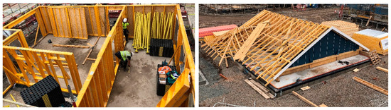 The data collection involved observing the system and situational dynamics of labor uptime to install the shell, including the timber kit erection labor and crane utilization for the different house types for 10 plots, whilst the manual handling issues involving plasterboards were observed for another nine plots and recorded with a post-observation summary of the work activities. This involved observing and recording the labor time of the joiners involved in the installation of the roof truss; the timber kit erect installation (Figure 3); and any extra labor assistance of apprentice joiners for the floor cassette and wall panels for house plots 43, 44, 45, 46, 48, and 50. The observation captured the uptime and downtime of the crane usage covering both the operator and the banksman as part of the contract hire agreement for house plots 36, 41, 42, 43, 44, 45, 46, 48, 49, and 50, sometimes using the GoPro time-lapse camera with video capabilities where possible for the different plots.