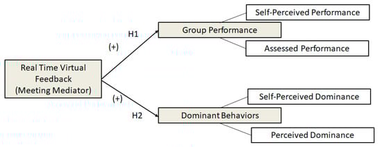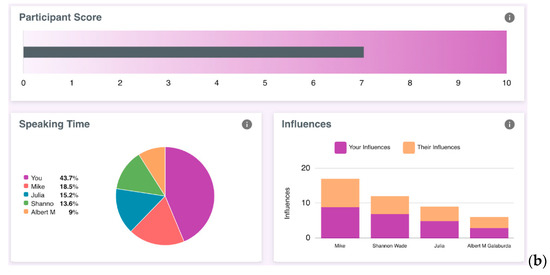 Our second hypothesis is based on the assumption that the opportunity to self-reflect on your own communication style increases the perception of specific relational behaviors. In particular, we are interested in exploring how participants perceive the protagonistic attitude during virtual meetings, which we operationalize as dominance (i.e., “someone is talking a lot and others are allowing this to happen”). The concept of dominance has often a negative connotation, as it is equated with physical, psychological, or verbal aggressiveness. The concept is used interchangeably with constructs of power and status. In our study we do not equate dominance to a class of destructive, attacking behaviors that may include verbal abuse or physical violence [27]. Our construct of dominance is aligned with the Burgoon and Hale classification [28], which positions dominance-submission (also labeled as power and relational control) as one of two dimensions among 12 fundamental categories of relational communication used by individuals to understand their interpersonal relationships. The construct of dominance that we use in this study is based on an interpersonal perspective and is defined as a “relational, behavioral, and interactional state that reflects the actual achievement of influence or control over another via communicative actions” [28] (p. 315). In the context of communication, dominance is not considered as a personality trait, but rather a dynamic state in which a combination of individual traits and situational factors play together demanding or encouraging dominant behavior [29]. The asymmetry of power creates a situation where an individual has more freedom of expression while the other person is left with anticipating the desires of the more dominant one. This interpersonal dominance can be observed through visual and verbal clues. For example, using a first version of the Meeting Mediator and sociometric badges, Kim and colleagues [30] observed how dominant people’s behavior significantly differs from that of nondominant people. The authors were able to identify 76% of the participants who were perceived to be “dominant” by themselves based on their distinctive speaking time, average speech segment length, and speech energy. A meta-analysis conducted on five databases and focused on studies exploring the association of dominance, power, speaking time, and leadership, found that speaking time is a strong reliable indicator of dominant behavior [31]. As illustrated in two other meta-analyses, the amount of time an individual talks is related to leadership and emergent power [31,32,33]. Based on these evidences, we propose the following hypothesis: