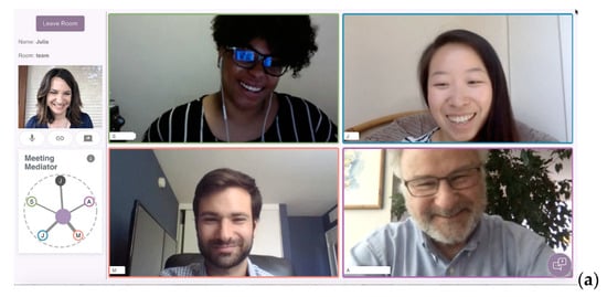- Kim, T.J.; Chang, A.; Holland, L.; Pentland, A. Meeting mediator: Enhancing group collaboration with sociometric feedback. Conf. Hum. Factors Comput. Syst. Proc. 2008. [Google Scholar] [CrossRef]