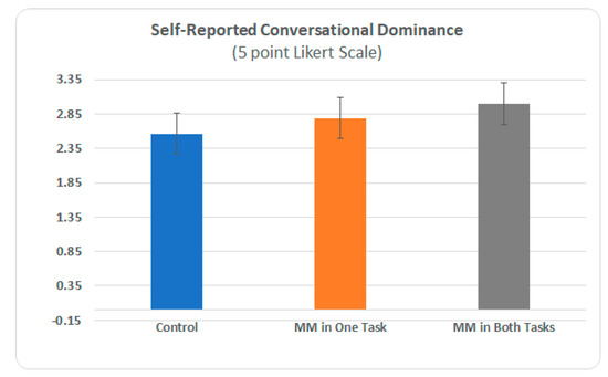 Participants reported a significant change in how they perceived the dominant behaviors of others when exposed to the Meeting Mediator (Figure 4). Being exposed to the Meeting Mediator twice resulted in a significant 15% increase in the perception of dominant behaviors of others having a positive effect on the group’s conversation (p = 0.004, two-sample t-test, n = 160), versus an 11% average improvement for a single exposure. Hence, our results support our first hypothesis as repeated opportunities to real time self-reflection increase perception of dominance. Self-reflection via the Meeting Mediator produced a 9.4% improvement in how participants perceived the dominant behaviors of others. Error bars show a 95% confidence interval, with a statistically significant difference between all treatment groups and the control group.