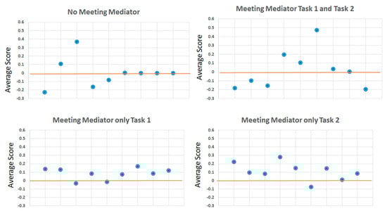 Figure 5 illustrates the variance in group performances on both tasks. When participants were not exposed to the meeting mediator in any of the tasks they performed, 50% of the teams performed a little better, while the other 50% performed a little worse. This condition simulates how people perform in a traditional, non-mediated situation, which could explain the split results in terms of performance. When participants were exposed to the Meeting Mediator only during the first task, they were given a real-world opportunity to practice how to manage a live conversation and how to control their communication style. The delta in performance for groups exposed to the Meeting Mediator only in the second task was also positive, with only one team performing marginally worse. In the two mixed treatments (Meeting Mediator in either task 1 or task 2) 15 out of the 18 groups performed either substantially better or a little better, which supports our assumption that the Meeting Mediator might have a positive impact on performance. At the same time, continued exposure to the Meeting Mediator did not impact performance, leading to only a partial support of our first hypothesis.