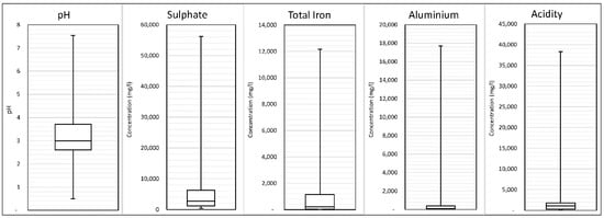 The pH distribution was more symmetrical with a median pH of 3.0 and maximum pH of 7.55. The observed circum-neutral pH range of between 6 and 7.55 may be attributed to the presence of Neutral Mine Drainage (NMD) sites in the referenced global AMD dataset. NMD has been distinguished as an independent mine water effluent due to its unique characteristics []. Mine water from five sites in the referenced dataset may be characterised as NMD. These sites displayed high geochemical concentrations with ranges between 0 to 8000 mg/L for SO4, 0 to 1200 mg/L for total Fe and between 0 to 800 mg/L for Al. The 75th percentile data distribution for pH was determined to be within the initial 49% of the distribution range. Table 3 summarises the quartile interval scales of the global AMD dataset’s geochemical composition.