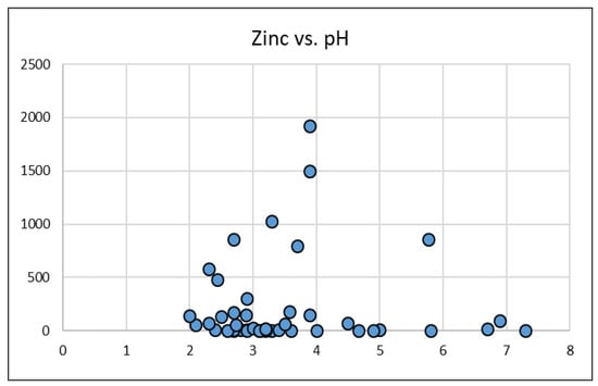 Figure 3 shows a box and whisker plot of the concentration distribution of Zn from the referenced dataset. Figure 4 shows a distribution plot of pH vs. zinc for the referenced dataset. The concentration of Zn at the first quartile exceeded the agricultural irrigation and safe permissible discharge limit for industrial effluents of 1 mg/L, respectively [,]. In total, 95% of the mine water data exceeded the safe environmental discharge limits of Zn. The total data distribution range for Zn was between 0 to 1912 mg/L. The dataset distribution of Zn was also found to be heavily skewed towards the bottom end of the range. The 75th percentile data distribution for Zn was determined to be within the initial 8% of the total range. Table 4 summarises the distribution range of the Zn dataset by quartiles. The sample frequency was greatest between the pH range of 2.0 and 4.0, which accounted for 78% of total site data. The highest concentrations of Zn were found between pH 3.0 and 4.0.