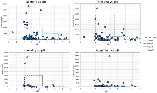 Figure 5 shows the distribution of Al, SO4, acidity and total Fe concentrations vs. pH with the data displayed against the Hill (1968) framework’s classifications. Approximately 75% of the referenced global mine water sites had pH values between 2.0 and 4.5. This pH range is categorised as Class I AMD in the Hill (1968) framework. When evaluating the dataset distribution against the entirety of the Hill (1968) framework it was found that only 46% of the mine sites met the criteria for Class I AMD. The other 29% of sites within the Class I pH range exceeded the specification limits for either Al, SO4, acidity or Fe.