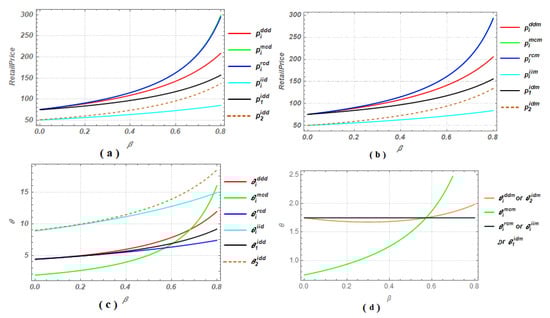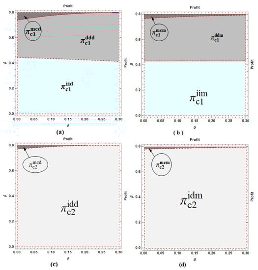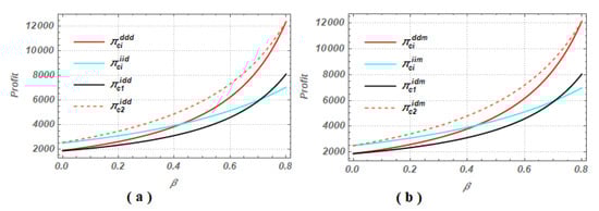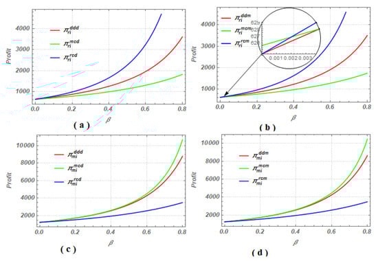 Theorem 1 demonstrates the following managerial insights: first, horizontal integration between upstream manufacturers or downstream retailers may reduce green quality levels for DIGPs. However, if members are maximizing their respective profits, then green quality levels will be always less for MIGPs compared to game scenarios RC ot MC. Second, for both DIGPs and MIGPs, consumers need to pay less if members of competing GSCs are interested in maximizing their respective profits. Consumers might have to pay more if members are integrated with horizontal rivals, but they can receive products at a lower quality level. Therefore, government regulatory agencies need to monitor how much consumers are affected under such deals. Graphical representations for profits for manufacturers and retailers in game structures DD, MC, and RC are presented in Figure 1. We consider , , , , , , for numerical illustration ([36,52]).