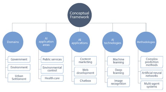 The literature review of Section 4 is mainly based on numerals 1, 2, and 5 of the conceptual framework. Due to the rapid growth of urban centers, some authors, such as Dellermann et al. [], propose grouping AI applications areas by domains, which would allow us to understand and analyze the innovations and their implementations generated within new smart cities.