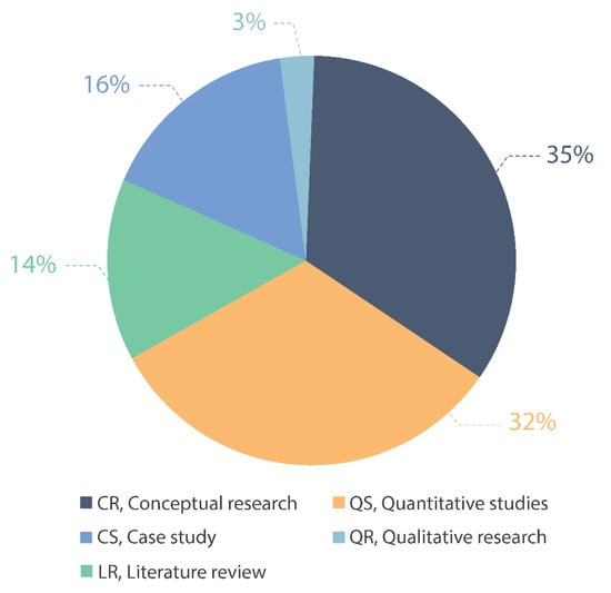 - Distribution of publications by research type: the most evoked research type was conceptual research (with 56 research) followed by quantitative studies (with 52), case study (with 26), literature reviews (with 24), and qualitative research (with 3) (Figure 2).