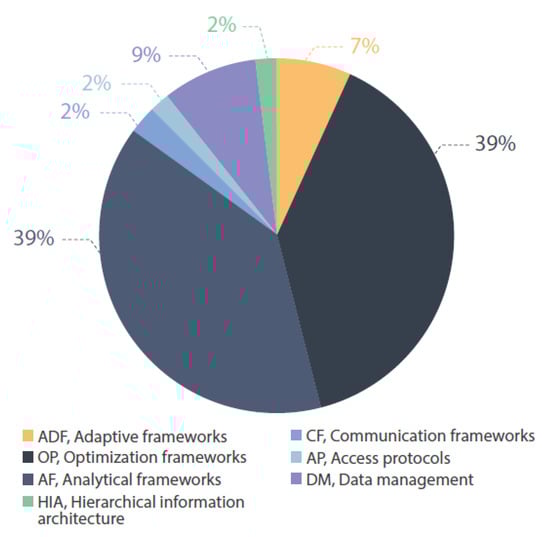 - Distribution of the solution methodologies: analysis of 161 investigations that make up the literature review shows that optimization frameworks and analytical frameworks are the most used methodological developments (with 63 research). Second, are data management (with 14). Third, we find the adaptive frameworks (with 11). Fourth, communication frameworks (with 4). Finally, the hierarchical information architecture and access protocols (with 3) (Figure 3).