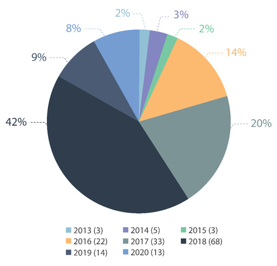 This work encompassed an extensive search of the literature of the most recent advances in methodological proposals for the development of the smart city concept published between 2013 and 2020, and was developed in four stages: (1) search of bibliography in indexed databases; (2) selection of investigations; (3) classification of investigations by domain; and (4) analysis of results. The methodology used was content analysis [] to analyze different reverse logistics models [], study progress advances in nanotechnology applied to smart packaging [], propose a conceptual framework for strategic management [], and classify AI methodological contributions with application to structural engineering [].