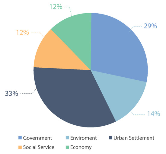 - Several publications by domain: in the literature review, a total of five domains with 161 articles were used. The urban settlement domain was the greatest contribution (with 53 research), followed by the government domain (with 46), environment domain (with 23), economy domain (with 20), and the social service domain (with 19) (Figure 5).