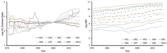 To obtain a more reliable estimate, Chang et al. [16] propose the statistical method for grouping the individual country’s variable. They first categorize the individual country’s GDP into ten groups by designed quantiles (we use the same quantile as used in Table 1 of Chang et al. [16]), and then their CO2 emission and GDP variables are weighted averaged by corresponding GDP ratio for each group. As in Chang et al. [16], moreover, we create CO2 per capita index (2000 = 100), in order to get rid of cross-country heterogeneity in the original variable. This paper strictly follows the way of Chang et al. [16], in order to generate the grouped variable. Finally, our final dataset consists of 10 groups over 47 years for each CO2 emission and GDP dataset. Figure 1 illustrates the generated grouped variables.