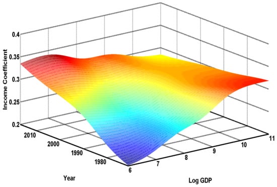 Nonparametric technique is invited to estimate the income coefficient, and therefore searching procedure for optimal bandwidth size is required. With bigger bandwidth size than the optimal, the income coefficient would be over-smoothed, making us overlook a high-frequency relationship. With smaller bandwidth size, on the other hand, the estimated income coefficient would be noisy, masking the important long-run relationship by the short-run noisy components. Following the recommendation of [16] for nonstationary data, we estimate the bias-corrected AIC procedure and the cross-validation method, and take five times the bigger one. We also adapted the interrelated two-dimensional bandwidth selection, giving us values, 0.1343 for time, 0.0484 for income.