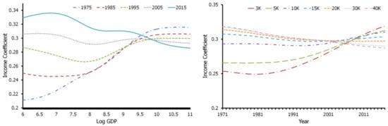 Figure 3 provides a two-dimensional representation of Figure 2 with fixed years and income levels. The income coefficients with the fixed years of 1975, 1985, and 1995, slowly increase over the income, and then become flatter at the high-income level. In the meantime, when the fixed year is 2015, the income coefficients slowly decrease over the income, and then become flatter. This result implies that, while the income coefficient of countries with high incomes has been higher, the opposite phenomenon has been observed in the last decade. The manufacturing-intensive countries would generate more CO2 emissions as they became richer, but the service-intensive countries would reduce the environmental pollutants in the early stages of growth. Once both manufacturing- and service-intensive countries reach a certain high-income level (USD 20,000), the income responses become insensitive to the income.