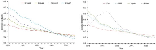 As an example, Group 1’s income elasticity of the left panel of Figure 4 was 0.38 in 1975, and was 0.24 in 2015, making the difference in the income elasticity −0.14 for forty years. Since all the variables in the model are in the log, we can provide an interpretation that CO2 emission has been decreased by 0.14, or 14% when Group 1’s GDP increases by about 110% for that period (USD 25,924 in 1975 to USD 54,456 in 2015). As such, the slope of income elasticity of Group 4 is much steeper than that of Group 1, which means that the size of reduction in CO2 emission of the low-income country has been much greater than that of high-income country.
