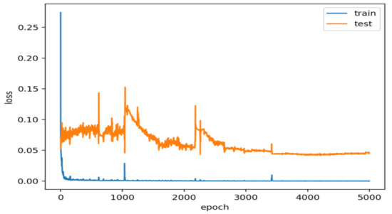 The dynamics of the change in the mean square error of the test and training sets during the fitting of one of the neural networks are presented in Figure 1. As can be seen on the plot, there are several peaks of increased errors that can be explained by the transition to the next batch of training. To determine the required number of epochs and the number of neurons, the dynamics of the change of the mean square error during the training period were investigated. The training stopped when the test set error on the plot began to grow steadily over the course of 10 periods of study. As it is shown, the neural network adapted rather quickly to the training set and for a long time for the test set. This indicates the need for deep learning. Moreover, the error of the test and training sets varies greatly among them, indicating the presence of sufficiently complex functional dependencies.