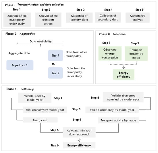 Initially, the municipality under study should be described by means of land use, demographic data, transport modes, municipal and inter-municipal fleets, spatial distribution of trips, and transport services (itinerary, demand etc.). Due to the lack of statistics on EE in municipalities and the need to analyze the consistency of the results, we recommend comparing the municipal outputs with those from the state or country (commonly available). Table 3 lists the minimum data required to implement each approach considering the selected tier.
