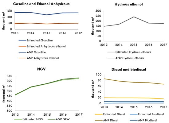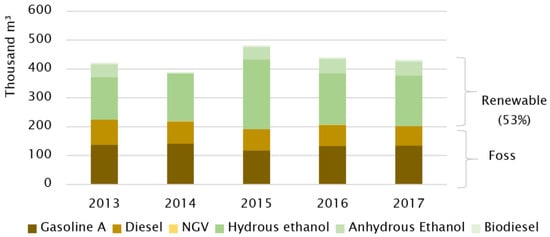 The aggregate fuel consumption data are collected from the Municipal Greenhouse Gas Inventory [37] and ANP (2018) [38]. In Brazil, gasoline is blended with 27% of anhydrous ethanol, while diesel is currently blended with 10% of biodiesel (although this value varied among the time series assessed, from 5% in 2013 to 10% in 2017). Figure 2 shows the fuel consumption from Sorocaba between 2013 and 2017. Since 2015, renewable energy has surpassed fossil fuel energy consumption, accounting for approximately 53% in 2017, mostly from hydrous ethanol use.