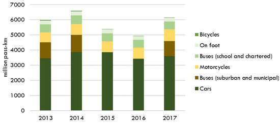 Figure 3 presents the transport activity by each type of vehicle and transport mode from 2013 to 2017 using the top-down approach. In view of the information presented in Figure 3, cars (fuel-inefficient vehicles) represent more than the half of the activity in Sorocaba, pointing out the need for actions to promote mobility by bus, bicycle, and foot. This is even more critical when considering that the municipality’s electric car fleet is negligible.