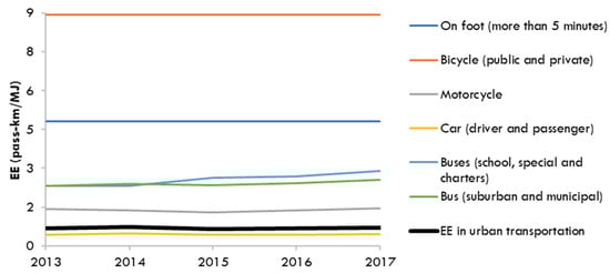 It is also important to include active transport. The transport activity from non-motorized trips is the result of multiplying the urban population by the share of pedestrians and cyclists, the frequency of trips, and the average distance by trip. On the other hand, the energy use from non-motorized transport is a result of the transport activity (pass-km) and EE (pass-km/MJ). In Brazil, the reference values for the EE of non-motorized transport are 4.8 pass-km/MJ for walking and 8.9 pass-km/MJ for human-powered bicycles [32].