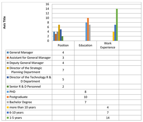 To closely fit the research background of this paper and realize the effective identification of green innovation risk in the manufacturing industry under the global value chain, the interviewees in this paper are all from medium-sized and larger enterprises. They are thus well-educated middle-level managers of high-quality enterprises. Fassinger and other scholars note that in the study of grounded theory, the appropriate number of survey samples is 20–30. According to the categorical determination of the sample number in the coding process, it is appropriate to select the frequency of concept words that appear more than 2–3 times in the data [35]. Under the principle of strictly ensuring theoretical saturation, this paper selects 25 manufacturing enterprises as its samples. The sample enterprises are all large and medium-sized manufacturing enterprises. These enterprises belong to the general equipment manufacturing industry; special equipment manufacturing industry; transportation equipment manufacturing industry; the computer, communication, and other electronic equipment manufacturing industries. The composition of the interviewees is shown in Figure 2.