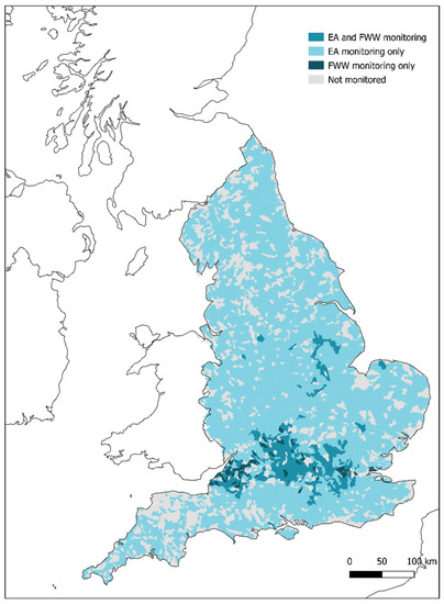 Regulatory water quality monitoring is also well established in the UK, which, as a member of the European Union, has been legally obliged to monitor a suite of physical, biological, and chemical indicators of water body ‘ecological status’ since 2000 as part of the EU Water Framework Directive (WFD) [5]. Implementation of the WFD in the UK is managed by the regulatory authorities of the devolved states of England, Wales, Scotland, and Northern Ireland. Because of the devolved nature of regulatory monitoring in the UK, it is not easy to obtain a single standardized dataset for the whole of the UK. Since the vast majority of FWW data in the UK are located in England, we chose to use regulatory monitoring data from England only.