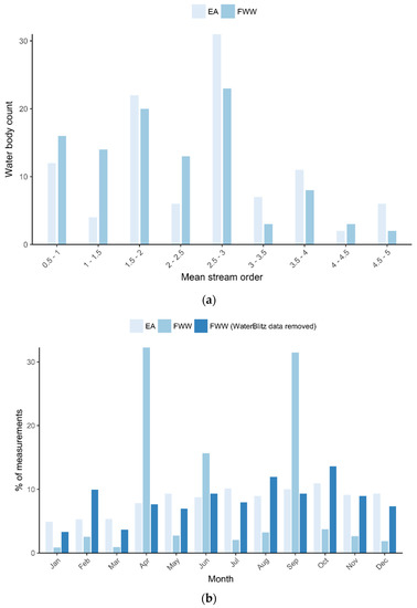 Histograms showing (a) average stream orders and (b) monthly distribution of data for both the EA and FWW datasets.