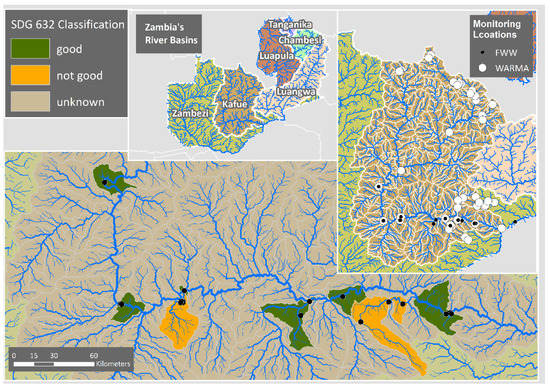 Distribution of WARMA monitoring and FWW monitoring in Zambia’s Kafue River Basin, showing indicator 6.3.2 classifications calculated based on FWW data (Data source: [18]).