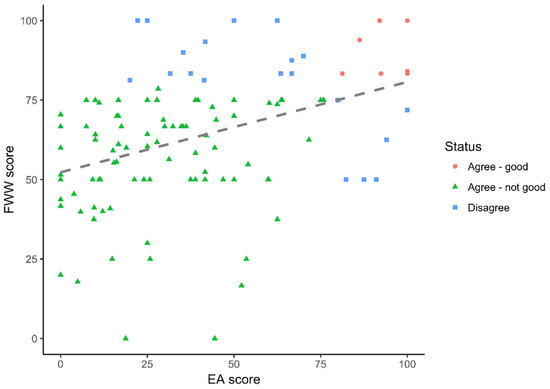 Comparison of water body indicator scores generated using EA and FWW data in England. Dotted line shows best fit linear regression line (R2 = 0.13). ‘Status’ indicates agreement in 632 water body status produced by each method.