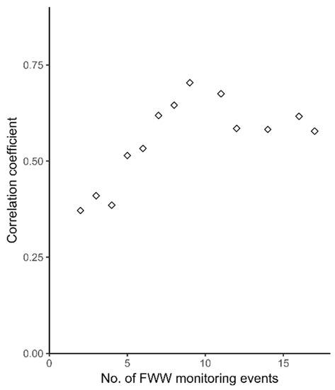 Plot showing increasing agreement (Pearson’s product moment correlation coefficient) between indicator scores produced using FWW and EA data with increasing FWW monitoring frequency.
