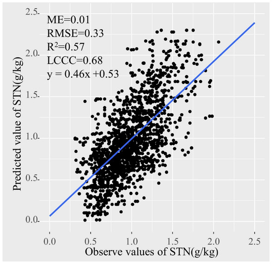 The relationship between the validation data and the model prediction results can determine the performance of the STN content predictions. Figure 5 shows the evaluation results of the RF model prediction accuracy. The RF model is found to be acceptable with a correlation of predicted results with the actual distributions. The RF model explains 57% of STN variance, and the prediction of the model is low in prediction error. The final RF model for STN captured the spatial variations of soil TN content, with a ME value of 0.01, an RMSE value of 0.33, and an LCCC value of 0.68.