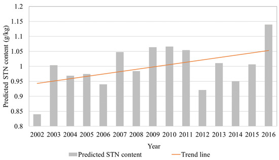 Figure 7 shows variations of the STN content in Shandong Province. The STN content has a stable growth rate with its highest value in 2016 at 1.14 g/kg. Without extreme statistical data, the STN content fluctuated. There was a significant increase from 2002 to 2010, while a downward trend showed up from 2011 to 2015. The predicted STN content fluctuated with an increasing trend from 0.84 g/kg in 2002 to 1.14 g/kg in 2016. Since the regional standard deviation decreased from 0.47 to 0.34 g/kg, the spatial distribution of nitrogen tended to be balanced.