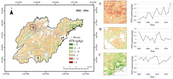 Spatial changes of the STN content and the typical zone where STN content increases (A), decreases (B), and remains unchanged (C) in Shandong Province from 2002 to 2016.