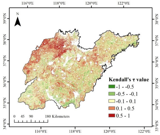 According to the results of the Mann–Kendall trend test, under the significance level of 95% or higher, the regions present a growth trend of STN which accounts for 64.7% in Shandong Province, mainly concentrated in the northwest plain area. There are also some areas in the eastern plain with an increasing trend of STN. The area showing an STN decline trend accounts for 35.3% and is mainly distributed along the eastern coastline and also in the southern mountainous areas. We regarded the region with the Kendall values in the range from −0.1 to 0.1 as the STN relatively unchanged region. It was found that the regions in which STN remained relatively stable mainly distributed in the southwest and northeast plains of Shandong Province (Figure 9).