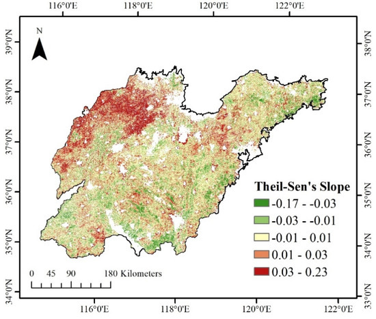 Theil–Sen’s slope estimator can estimate the magnitude of the change. It can be seen that the variation range of STN is within the range from −0.17 to 0.23, where the median is 0.01. Among them, it is in relatively 80% of the region that the variation intensity of the STN is not drastic, ranging from −0.03 to 0.03. The area with the largest positive slope is centrally distributed in the northwest of Shandong province. The area with the largest negative slope is in the southeast and the east coast, which is small and scattered. (Figure 10).