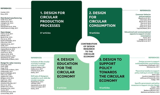 To address this question, we carried out a systematic literature review of articles published in key industrial design journals identified by Gemser et al. [] as the most influential outlets in the field. The review identified a number of design practices in four thematic areas, which can potentially contribute to the circular economy from different angles: (1) design for circular production processes, (2) design for circular consumption, (3) design to support policy towards the circular economy, and (4) design education for the circular economy. Addressing the research question above specified also gave us the opportunity to shed light on where future industrial design research for the circular economy might and should move forward.