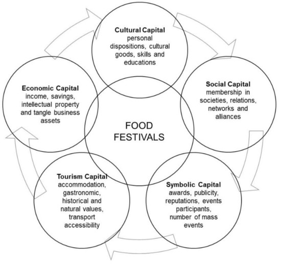 Conceptual framework to analyze relationships between capitals and food festivals. Source: Author’s own elaboration.