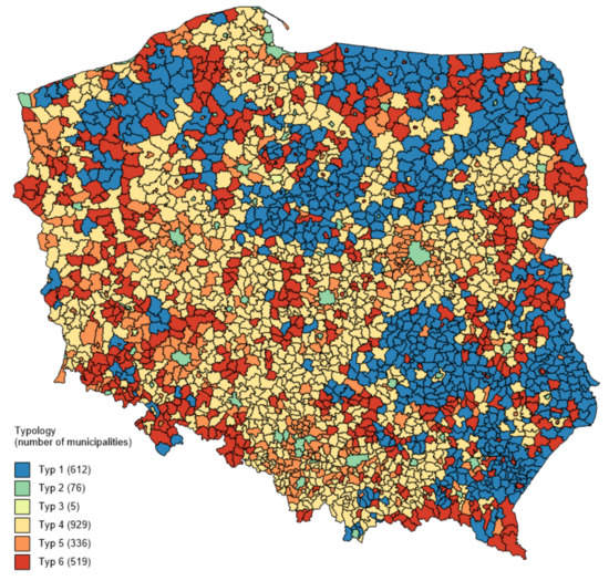 The indicators describing individual capitals were standardized and combined, thus making it possible to obtain a synthetic measure for each capital group. Then, municipalities were grouped into 6 classes using the k-means cluster analysis algorithm (Table 2). For greater readability of the results, the profile control tables present both data on the location of the center of gravity of individual types and figurative symbols of numerical values. Table 2 presents the potential of capital in Poland in terms of structure. The total number of examined administrative units is 2477, including 302 urban municipalities, 642 urban-rural municipalities, and 1533 rural municipalities. The conducted research shows that the biggest type 4 covers about 37% of municipalities in Poland, mainly of an urban-rural nature. It is also a group of municipalities that presented moderate capital values and a low level of symbolic capital. Type 3 is the smallest group, which includes only 5 cities.