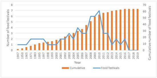 Today, there are strong links between sustainable development, food, and tourism, which are of interest to academicians and practitioners alike. Food production and consumption are important aspects of the development of sustainable tourism and food systems. In the long run, tourism affects culinary trails, food value chains, and distribution channels [5]. Sustainable food development influences not only modern diets and food systems, but also has an important historical context. Locally distinguishable food can be a tourist attraction and can shape the image of the destination [58]. Food festivals that promote local food are associated with many attributes of “localness”, including freshness, support for the local economy and small farms, as well as environmental sustainability [41]. They are organized spontaneously, at the local level, usually without the participation of state authorities—as a rule, they are included in larger tourism projects aimed at affirming locality (traditional forms of economy, production, and processing). Food tourism, which includes food festivals, allows tourists to get to know what is authentic in the culinary heritage, production, preparation, and tasting of products and dishes of a given region, without disturbing the symbiosis of society and tourists in this area [58].