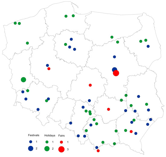 For the purposes of the study, an attempt to catalogue all food festivals in Poland was carried out. The process of collecting data on festivals and their locations was followed by a procedure that had already been used in similar studies [18]. In the first step, the resources of the Internet were used and we identified the largest possible number of food festivals in Poland by means of internet search engines and keywords. Then, we reviewed the websites of local municipalities, organizations, and social networks related to festivals. Additionally, the research was supplemented, in some cases, by phone calls and e-mail inquiries. In total, 64 food festivals were identified. In Figure 3, the bar graph shows both those that arose in a given year and those that take place cyclically, while the line chart shows only newly created events. The collected data present all identifiable festivals according to the adopted criteria (thematic, of a supra-specific range, determining the economic effect). Research shows that most of the food festivals were created between 2007 and 2010. Then, the dynamics of their formation clearly weakened. According to the adopted criteria, no new food festivals could be identified after 2016. Some identified examples of the oldest festivals in Poland after the Second World War are the “Święto Kwitnącej Jabłoni” (Festival of Blooming Apple Tree) in Łąck in Małopolskie voivodeship and the “Winobranie” (Grape picking) festival in Zielona Góra in Lubuskie voivodeship. Food festivals are organized in different regions and on different times (Table 3 and Figure 4). The period of the highest festival activity are mainly the summer months: June, July, August, September. This is mainly conditioned by weather and the plant vegetation calendar in Poland. Thanks to this, festival participants can discover local flavors and agricultural products of the highest quality and freshness. Food and food events are grouped into three categories—festivals, holidays, and fairs. Festivals are a series of events, usually of one type, which are an overview of achievements in a given field, organized at one time and under a common name, often in the form of a competition. A food holiday, on the other hand, has definitely a local character and focuses on the presentation of local food products, historical reenactment, and discussion of local history related to agricultural and culinary traditions. The holiday has a specified theme and refers to a single local product, e.g., cherry, potato festival, or cheese holidays. As part of the holiday, all these elements will reactivate tradition, refresh memory, and introduce a festive character to the calendar of local events. A food fair is a large event related to the exhibition of international or national food products, combined with sales.