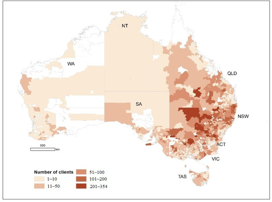 The spatial distribution of clients within each state and territory is demonstrated in Figure 1 and Table 3, respectively. Figure 1 displays the count of unique clients per postcode and Table 3 indicates the number of unique IDs per jurisdiction. The spatial pattern at this scale shows the highest number of interactions being concentrated in regional NSW, VIC and QLD.