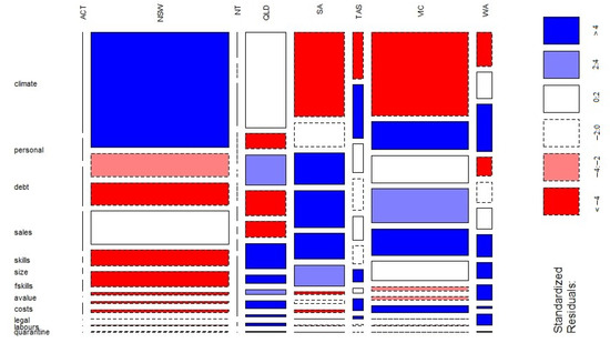 The mosaic plot in Figure 2 illustrates the conditional relative frequency of each cause per State/Territory. Column width is proportional to the percentage of instances allocated to each state (based on the overall number of instances) which highlights NSW and VIC as the states with the highest number of records. On the other hand, column height represents the relative frequency of each cause within each state (so, for example, Climatic variation was the most reported cause for NSW but not for WA). Each column box is coloured according to the difference between the observed and expected frequency values (residuals), with blue noting observed values higher than what was expected if the distribution was random; red representing observed values lower; and no coloured cells identifying observed values matching an expected distribution. In terms of causes reported overall, Quarantine, Labour/skills shortage (labours), Regulation/legislation (legal), Increased operating costs (costs), Declining asset values (avalue) and Financial management skills (fskills) are less important (aligned with Table 3 numbers). These categories were removed for running the Χ2 test, as were the data for the ACT and NT given the significantly low number of records for these jurisdictions.