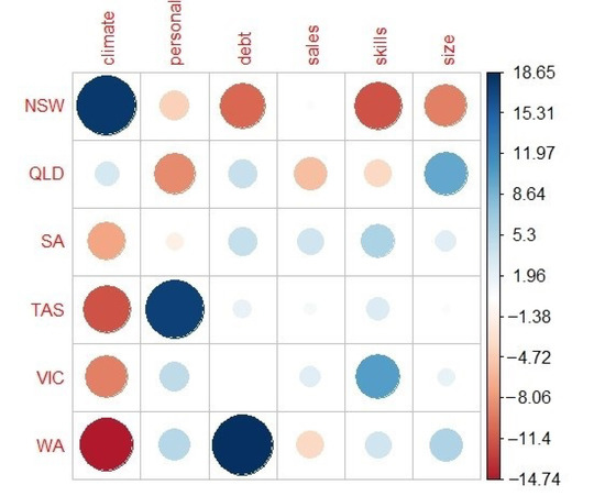 Χ2 residuals provide further insights on the nature of the association between the two variables, causes and client’s location. Figure 3 displays graphically the magnitude and direction of Χ2 residuals, with blue indicating a positive association between cause and state; and red denoting a negative association (or no association) between variables. The analysis of Figure 3 is aligned with the descriptive analysis provided by Figure 2. Climatic variation (climate) is strongly associated with NSW, but not with WA and TA. Personal factors (personal) are strongly associated with clients in TAS, and Debt levels (debt) with clients in WA.