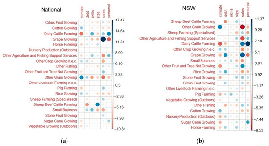 The relationship between industry sector and reported causes of client difficulty was evaluated with a Χ2 association test, with a null hypothesis that causes of difficulty cannot be associated to any specific industry sector (based on the number of instances recorded for each sector type). Based on the previous analysis and to be able to run a valid test, only the causes of difficulty Climatic variation (climate), Debt levels (debt), Enterprise management skills (skills), Enterprise size (size), Low sales and commodity prices (sales), and Personal factors (personal) were retained. Industry sectors were also removed when the number of instances allocated to at least one cause was less than five. Data for the assessment at a national level and a representative State level are presented in Figure 4a,b, respectively.