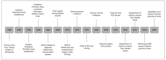 The potential for copper-nickel mining in Northeastern Minnesota has been known since the late 1800s (Figure 2), but these minerals were not exploited as iron mining sustained northern Minnesota. In 1966, the International Nickel Company, Inc. (INCO) was the first company granted copper-nickel mineral leases in the state, and in 1974, INCO filed for permits with the U.S. Forest Service to mine along the South Kawishiwi River, near the southern border of the BWCA. The proposal was met by fierce opposition from then Governor Wendell Anderson, who was concerned with the project’s impacts on the BWCA [42]. The Minnesota Environmental Quality Council (EQC) soon developed a policy that required environmental, social, and economic impact studies on all proposed copper-nickel projects, as well as a moratorium on mining until a regional assessment could be completed. That assessment, the Minnesota Regional Copper-Nickel Study [43], found that copper-nickel mining had the potential to meet or exceed existing environmental guidelines, create over 2000 new jobs, and produce over $50 billion in profits. However, falling mineral prices, combined with the expense of extracting low-grade ore and public concern over environmental impacts, precluded mining at the time.