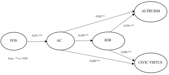 The results presented in Table 5 indicate that AC indirectly affected altruism (β = 0.232, p < 0.001), and civic virtue (β = 0.260, p < 0.01), through KSB. These results support Hypotheses 4 and 5. Thus, KSB fully mediated the relationship between AC and altruism, and partially mediated the relationship between AC and civic virtue. The results of the multiple mediating effects of AC and KSB are shown in Table 5.