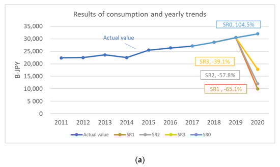 Figure 2 shows the results for tourist consumption from the economic evaluation. Figure 2a shows that the tourism economy grew from 2011 (detailed results are shown in Appendix A, Table A2), and Figure 2b shows equivalent monthly data. In SR 1, 2, and 3, the period from January until June shows the actual values of counted tourists. SR 1 was at the same level from June to December, SR 2 was at the level of June until September, followed by recovery from October, and SR 3 recovered from July. SR 0 is the same level as the past 10 years. Although the previous 10 years (2011–2019) experienced no major negatives, a large loss was confirmed for 2020. This is because tourism has experienced its worst situation of the past 10 years due to the influence of COVID-19.