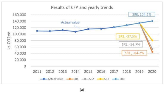 Figure 3a shows the results for CFP from the environmental evaluation (detailed results are shown in Appendix A, Table A3) and indicates that tourism GHGs have increased annually since 2011. Figure 3b shows the equivalent monthly data. In SR 1, 2, and 3, the period from January until June was based on the actual values of counted tourists. SR 1 was at the same level from June to December, SR 2 was at the level of June until September, before recovering from October, and SR 3 recovered from July. SR 0 was at the same level as that of the previous 10 years. Again, the figure shows that there was no major reduction during the past 10 years (2011–2019), and that a large reduction was confirmed for 2020. This is because the CFP associated with tourism has improved compared to the past 10 years due to the influence of COVID-19.