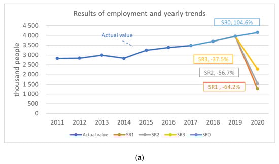 Figure 4a shows the results for employment from the social evaluation (detailed results are shown in Appendix A, Table A4) and indicates the growth in tourism employment since 2011. Figure 4b provides the equivalent monthly data. In SR 1, 2, and 3, the period from January until June was based on the actual values of counted tourists. SR 1 was at the same level from June to December, SR 2 was at the level of June until September, followed by a recovery from October, and SR 3 recovered from July. SR 0 was at the same level as that of the past 10 years. As for the previous evaluations, no major reduction was seen during the past 10 years (2011–2019), and a large decline can be confirmed for 2020. This is because tourism employment experienced its worst situation of the past 10 years due to the influence of COVID-19.